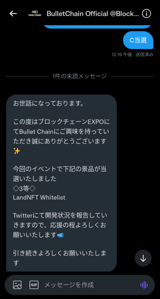 これがツイッタ―でのやり取り画面。NFTの土地もらったら、やってみようと思います。