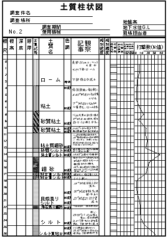 現場の土質が分かる資料になります。打撃数(N値)を参考にどこまで掘削するかが決まります。