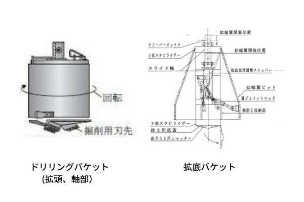 軸部はドリリングバケットを使用して、掘削しバケット内にたまった土を地上へ上げて搬出します。(拡頭部の形状は異なる場合があります)