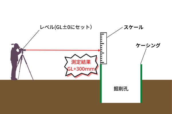 ケーシング建込が完了したら、ケーシング天端がGLからいくつ上がっているか、レベルで確認しましょう!