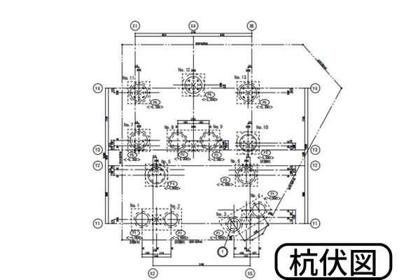 杭伏図は、杭工事前に杭芯を墨出しをするために必要な図面になります。