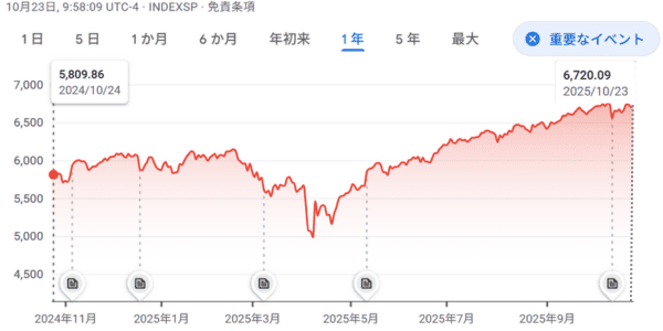 ではアメリカの時価総額が大きい約500社をまとめたパックである、S&P500の1年間のパフォーマンスをみてみよう。(このチャットはドルベースです)