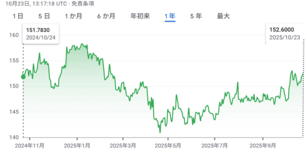 では2024.10月末~2025.11月までの日本円とドルの為替をみてみよう。