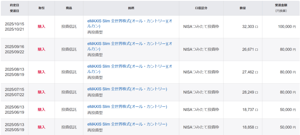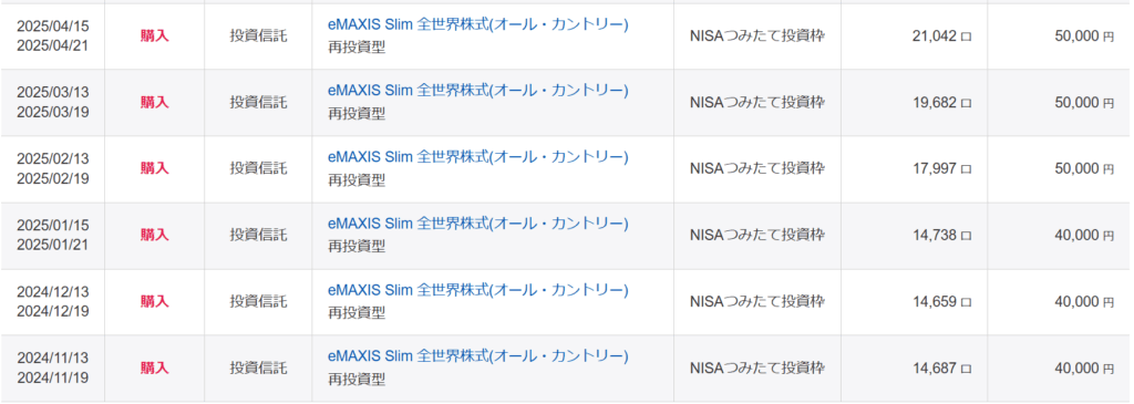 オルカンに積立したのは、2024年11からだ。拙者が購入したオルカンの名前は、eMAXIS Slim 全世界株式(オール・カントリー)だ。1年間の毎月の購入金額がこちら。