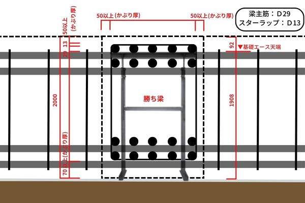 勝ち梁に基礎エースを用いる場合の高さとしては、梁上のかぶり厚と梁主筋径、スターラップ径を梁成から引いた数値になります。