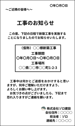下記のような挨拶文をお渡しして、工事について少し説明をします。