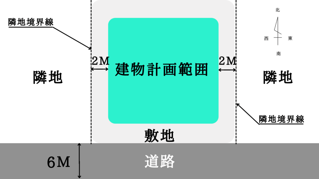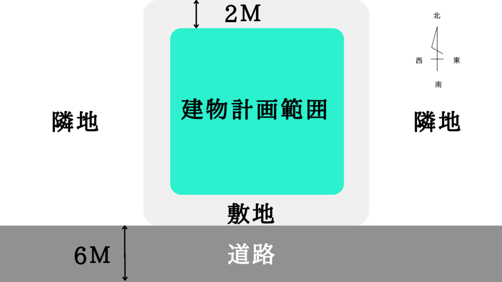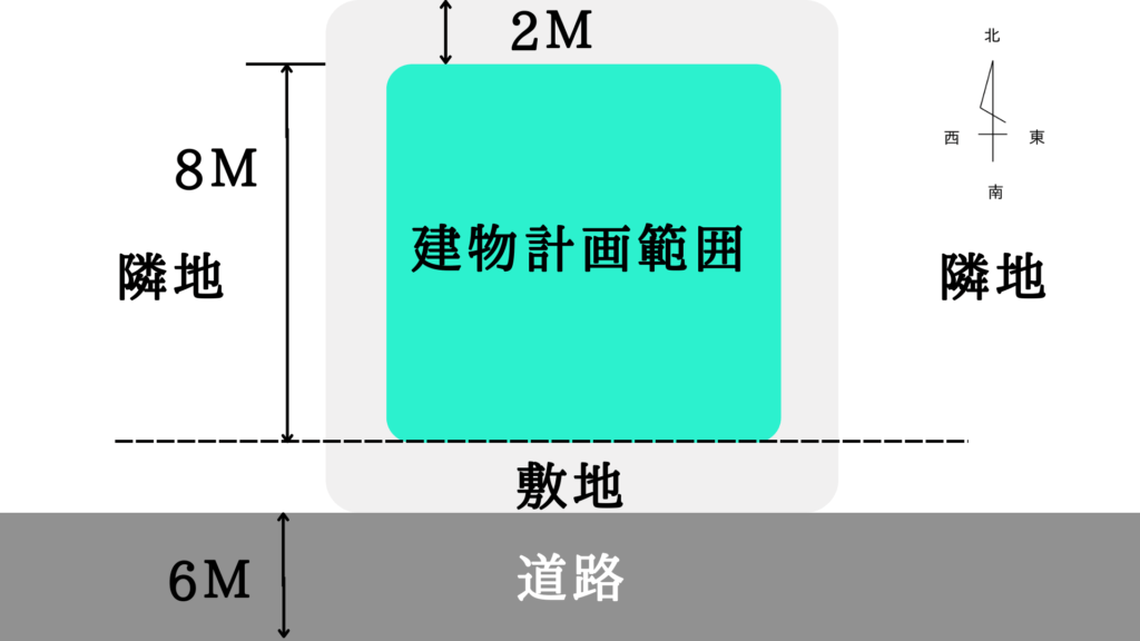 建物と北側の隣地境界線との空き幅が2m、計画する建物の奥行きを8mとしよう。