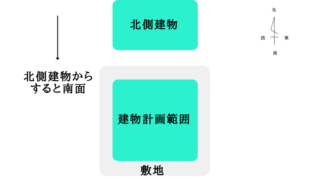 今回対象の敷地からみた北側の建物があります。北側の建物からすれば今回対象の敷地は南面になります。