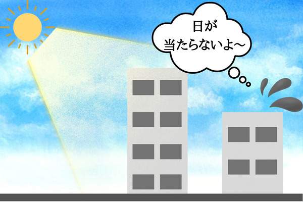 左の建物が高すぎるので、右の建物に太陽光が当たりませんね。元々右の建物があって、あとから左の建物が建ったら部屋が暗いって揉める原因になりますよね…
