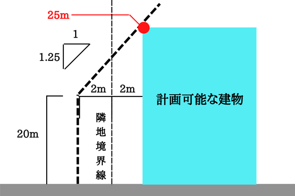 住居系 : 1.25×(2×建物と隣地境界線との空き幅)+20m