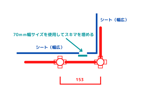 このように入隅部はインチサイズ同士でシートを張ることができますが、153mmが出てくると