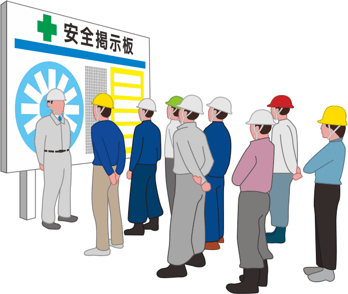 会場には注意事項等が記載できる大きな朝礼看板があり、現場の図を貼るなど工夫、活用し朝礼を進行していきます。