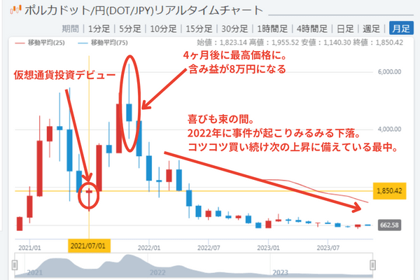 ちなみに拙者が投資を始めたのは、2021年の7月からだ。(上記画像は、お気に入り銘柄のポルカドットのチャート)