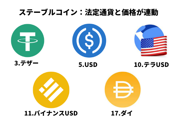 テザーの他にもUSD、テラUSD、バイナンスUSD、ダイがあり、いずれもステーブルコインで開発元が違う銘柄があります。(価格も微妙に異なる)