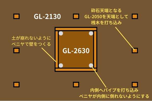 ・フーチング GL-2500mm下端 → GL-2630mm下端で掘削