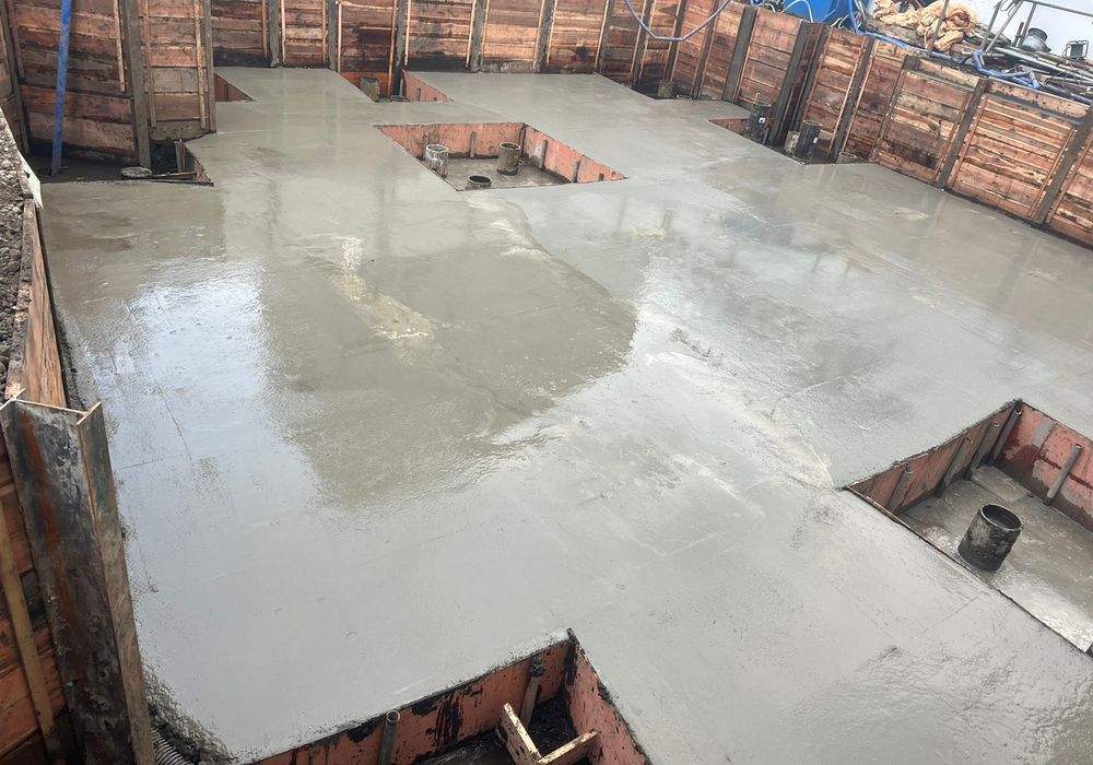 フーチング、耐圧盤、基礎梁、釜場の配筋の前に均しコンクリート(捨コン)を打設します。