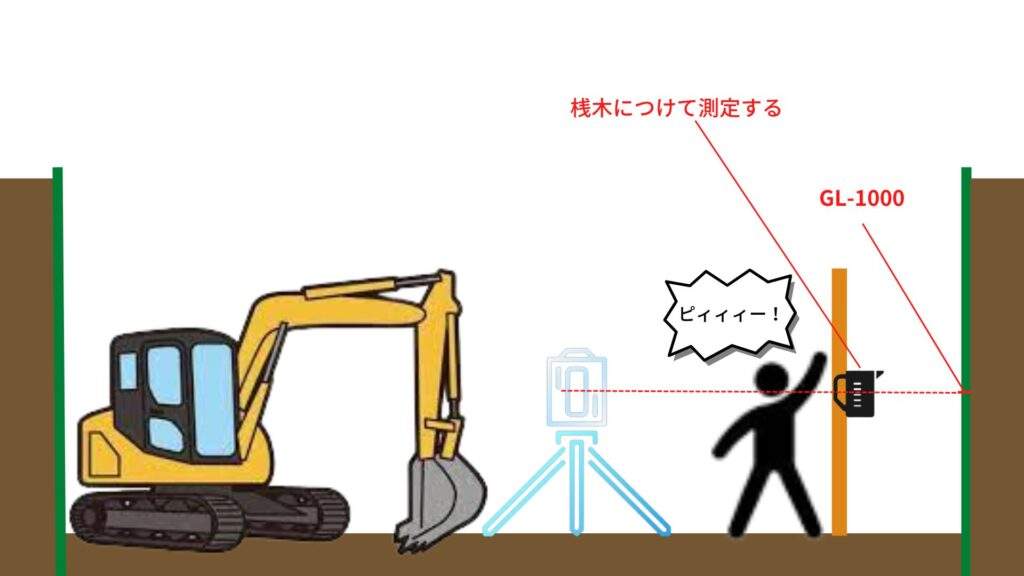 ある程度掘り進めたら、レベルをGL+1000に据えて3mほどの長さの桟木を用意しよう!