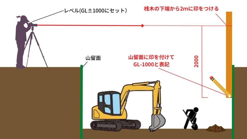 山留面の四方にGL-1000mmの印をつけて、これを基準にして掘削します。