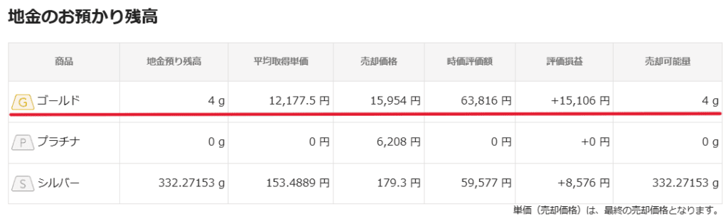 ゴールドとシルバーを約5万円ずつ購入した画像がこちら。正確には約48000円でゴールドを4g購入。現在価格は約16000円なので、‶約64000円″になったわけです。