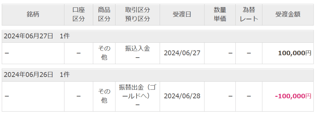 2024.6.27にマネックス証券へ10万円を入金した画像がこちら。