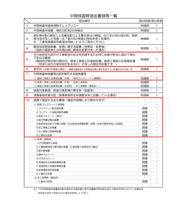 中間検査時提出書類等一覧のなかで、現場で用意する書類は赤枠をしてあります。