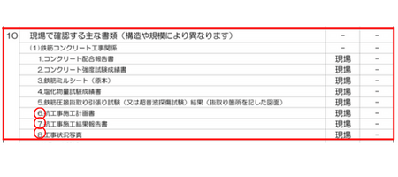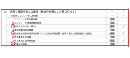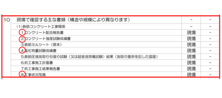 上記の赤丸4つになりますが、1のコンクリート配合報告書は提示する必要はありません。
