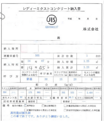 代わりにコンクリート打設当日にもらうコンクリート納品伝票が必要になります。