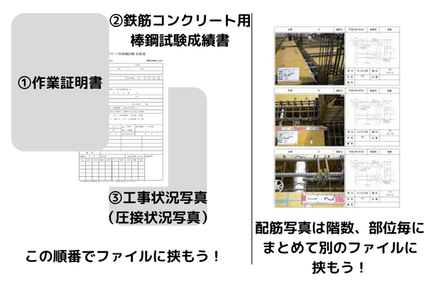 ①の作業証明書とは、その日に圧接した箇所を図面に記載し何本圧接したかを圧接業者さんが記入します。それを受け取り部位毎にインデックスや付箋を付けファイルにまとめましょう!