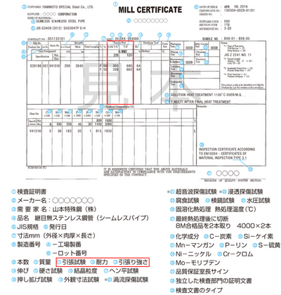 このタグとミルシートに書かれていることがリンクしているか確認します。