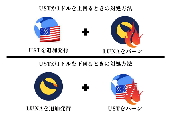 もしUSTの価格が1ドル以上になりそうな場合USTの価格を下げるために追加発行し、LUNAをバーンする。逆の場合はLUNAを追加発行しUSTをバーンし1ドルを保つようにしている。