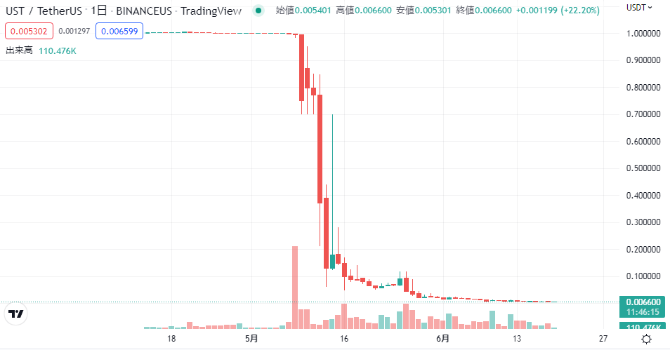 USTはステーブルコインとして、1ドルの価格と連動した銘柄のはずが価格を保てなくなった。つられて韓国産銘柄であるテラ(LUNA)も約10%の下落をした。