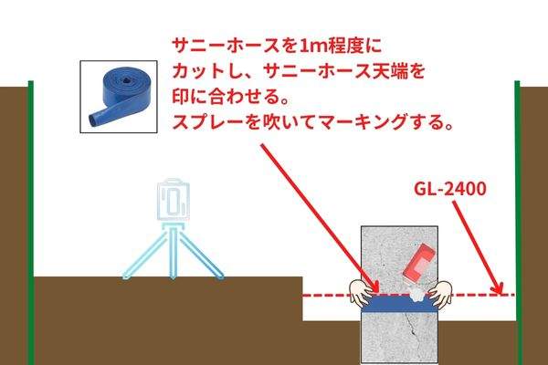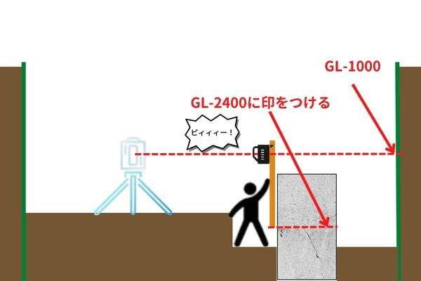 例えばGL-2400が杭頭斫り天端の場合、図のように桟木の下端をGL-2400に合わせます。