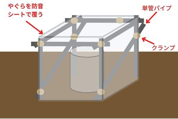 単管パイプとクランプで骨組みをつくり、その骨組みを防音シートで覆って完成です。