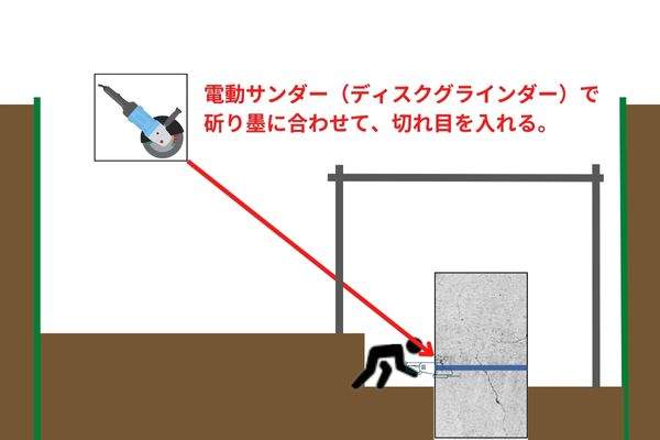 斫る前にスプレーで出した斫り墨に合わせて、電動サンダー(ディスクグラインダー)で切れ目を入れてあげると仕上がりがキレイにできます。
