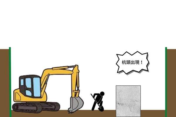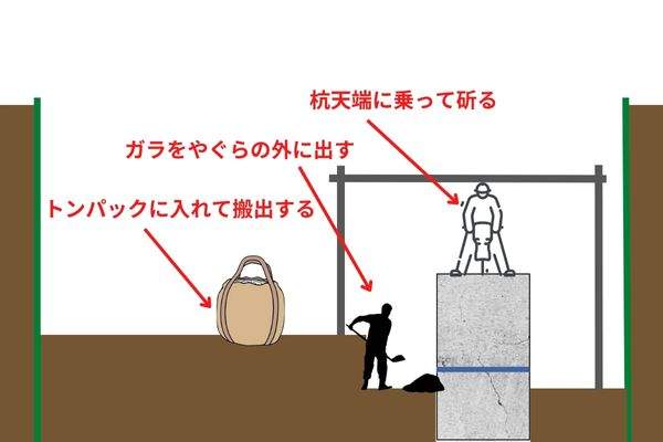杭頭周辺を掘削レベルまで掘り進めたら、斫っている最中に発生する騒音とほこりを近隣側へ最小限にするため図のようにやぐらを組みましょう。
