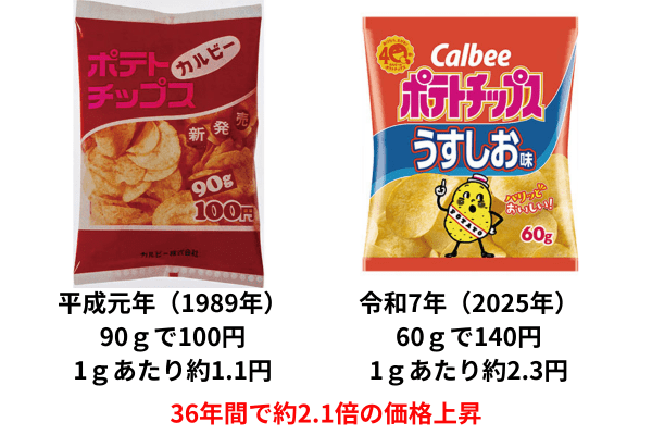 ちなみに平成元年にカルビーのポテトチップスが販売され、90gで100円で販売されていた。