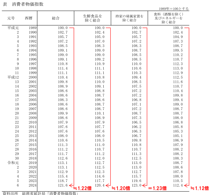 結論から言うと平成元年(1989年)から令和6年(2024年)の35年間で物価は約1.2倍になっている。