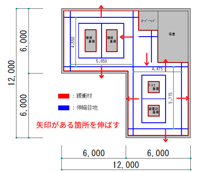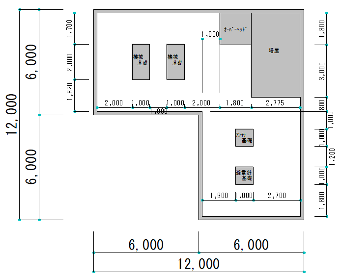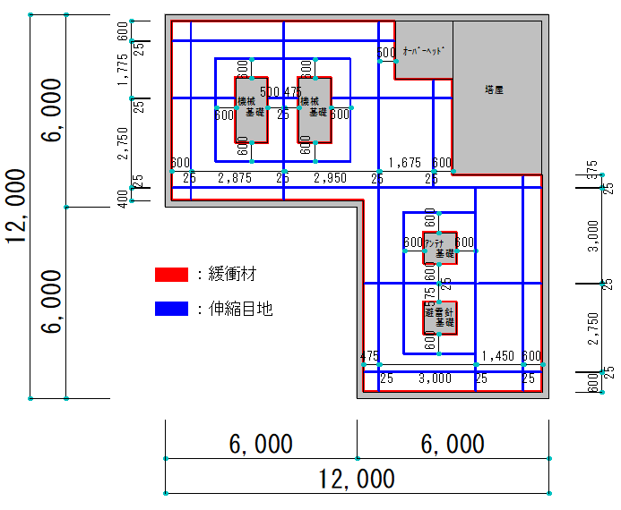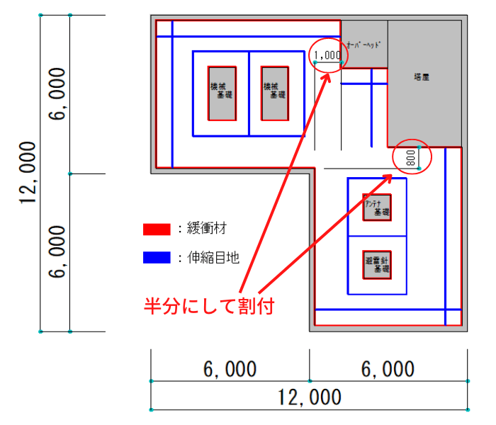 パラペット、機械基礎等の立ち上がり面から600mmで割付、機械基礎と機械基礎の間は離れの半分で割付しました。